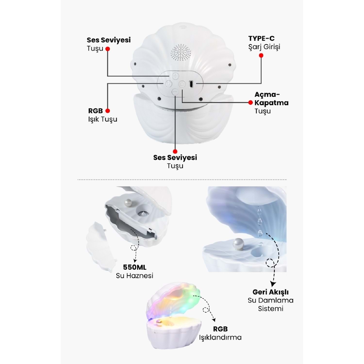 - Hava Nemlendirici - Bluetooth - Su Kapasitesi: 500 ML - Çalışma Süresi : 2 Saat - RGB - Güç Kaynağı: USB Kablo - Geri Akışlı Su Damlama Sistemi - Boyut: 56 x 67 x 41 cm